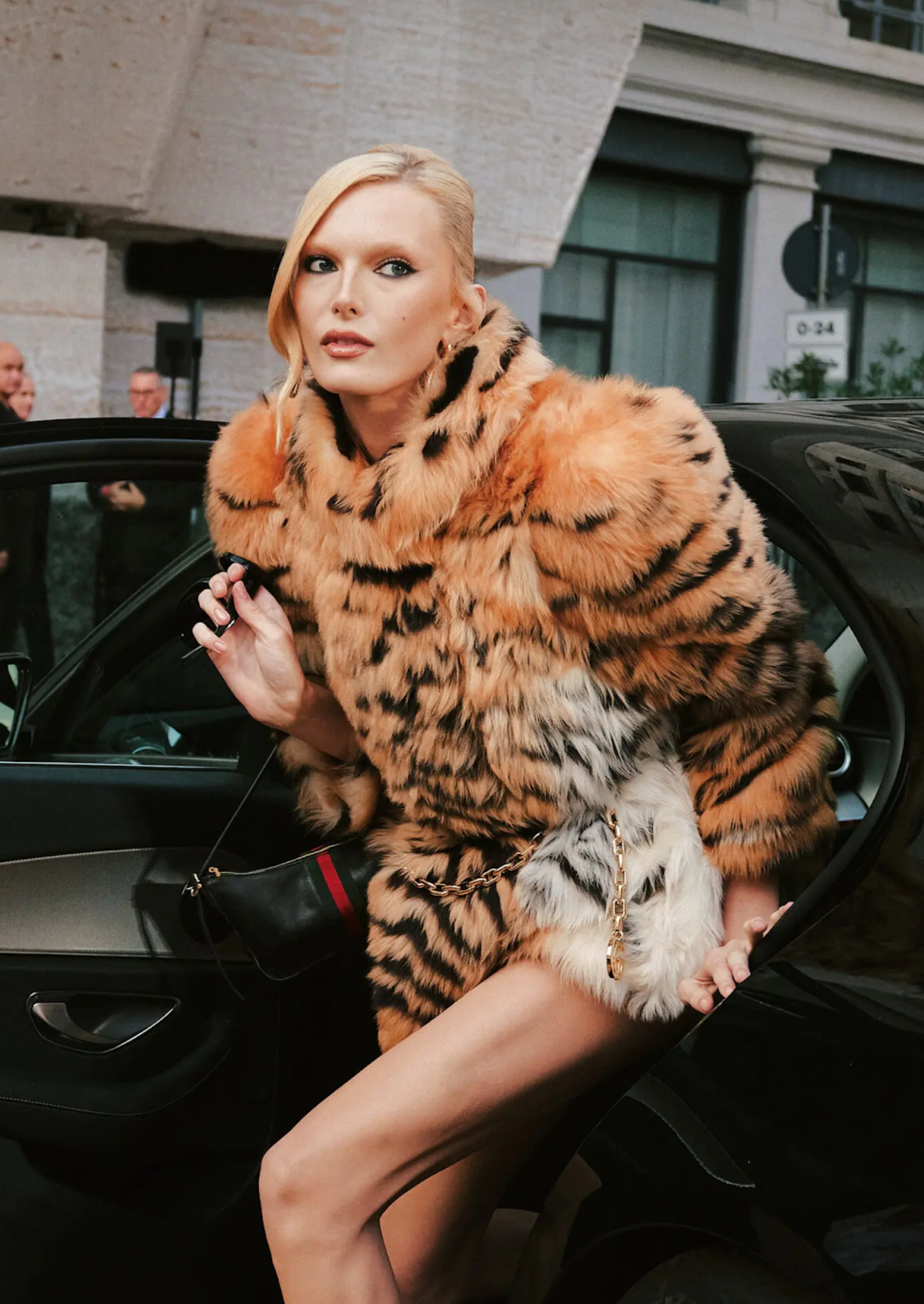 When asked about the show and the purpose of the pieces, Demna answered: “It [garments] is political and social commentary on what is happening around us. I want to go into what a trench coat actually represents, its social status.” “La Famiglia” could be just as political; the collection is like a subtle artistic acknowledgment that fashion is not the most important, sacred, or defining part of human culture and society right now. Such self-mockery became clear when stars arrived at the Milan premiere wearing pieces from the collection whose names reflected their real lives. Supermodel Alex Consani arrived wearing the look “The Bomb” (Top) which she modeled herself in the lookbook (Bottom). In 2024, Consani was named Model of the Year at the Fashion awards, being the first transgender woman to do so. Her recognition shattered the glass ceiling for trans women, and her fiery speech acknowledged the transgender trailblazers that came before her. Dressing her in “The Bomb” was the only acceptable choice for such an explosive and eccentric icon.